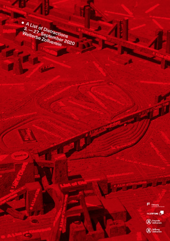 ↳mit Elke Seeger: A List of Distractions. Eine raumgreifende Ausstellung der Folkwang Universität der Künste in Kooperation mit der Stiftung Zollverein – zu sehen im öffentlichen Raum des UNESCO-Welterbes Zollverein. Mit künstlerischen Arbeiten von Julius Barghop, Carsten Barth, Ayla Buchholz, Marie Eberhardt, Linda Hafeneger, Hendrik Hinkelmann, Marie Laforge, Katharina Ley, Ruth Magers, David Müller, Anja Segermann und Anton Vichrov. 3.9.–27.9.2020, Welterbe Zollverein, Essen. Gestaltung von Kai Behrendt. Zur Ausstellung ist ein Katalog erschienen als Folkwang Edition | Book 009, Essen 2022. 📸