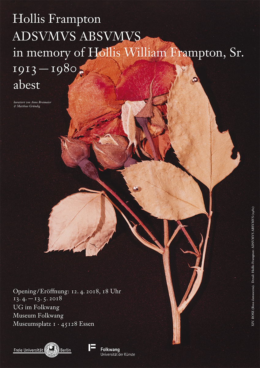 ↳mit Anne Breimaier: Hollis Frampton: ADSVMVS ABSVMVS, in memory of Hollis William Frampton, Sr., 1913–1980, abest, 13.4.–13.5.2018, UG im Folkwang, Museum Folkwang, Essen. Gestaltung von Malte Lambert. 📸