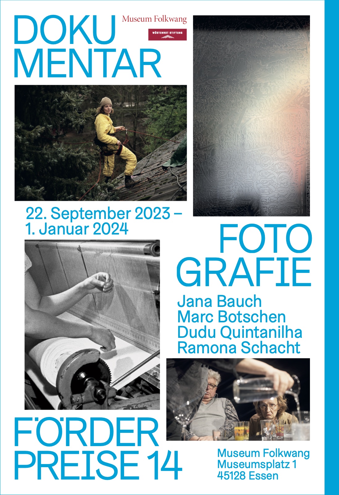 ↳Dokumentarfotografie Förderpreise 14 der Wüstenrot Stiftung. Mit Werken von Jana Bauch, Marc Botschen, Dudu Quintanilha und Ramona Schacht, 22.9.2023–1.1.2024, Museum Folkwang. Gestaltung von Katharina Köhler. Zur Ausstellung ist ein kostenloser Katalog erschienen. 📸