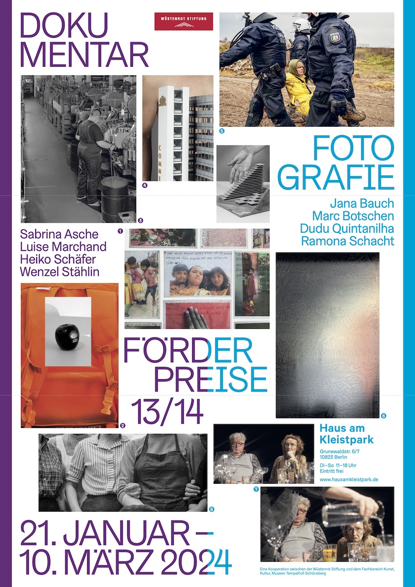 ↳Dokumentarfotografie Förderpreise 13/14 der Wüstenrot Stiftung. Mit Werken von Sabrina Asche, Luise Marchand, Heiko Schäfer, Wenzel Stählin, Jana Bauch, Marc Botschen, Dudu Quintanilha und Ramona Schacht, 21.1.2024–10.3.2024, Haus am Kleistpark, Berlin. Kuratiert mit Christin Müller. Gestaltung von Katharina Köhler und Wolfgang Schwärzler. 📸