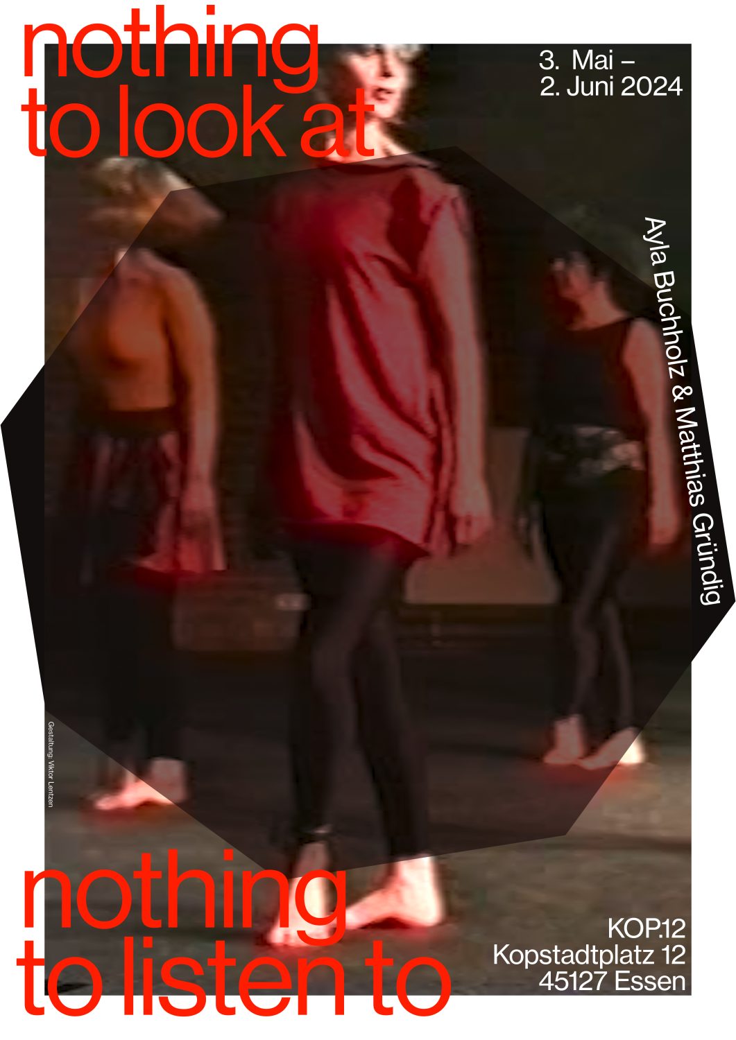↳nothing to look at | nothing to listen to. Ayla Buchholz & Matthias Gründig, 3.5.–2.6.2024, KOP.12, Essen. Infoplakat zur Ausstellung gestaltet von Viktor Lentzen. 📸 🎵