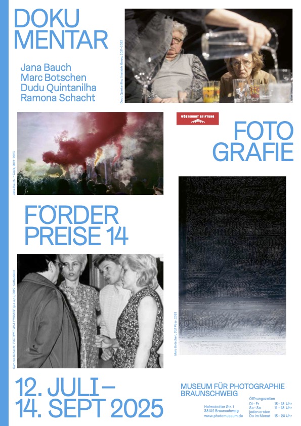 ↳Dokumentarfotografie Förderpreise 14 der Wüstenrot Stiftung. Mit Werken von Jana Bauch, Marc Botschen, Dudu Quintanilha und Ramona Schacht, 12.07.–14.09.2025, Museum für Photographie Braunschweig. Gestaltung von Katharina Köhler.